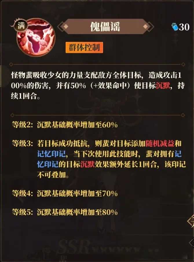 傀儡谣:对敌方全体造成伤害,有一定概率对敌方施加沉默效果,附带印记效果。