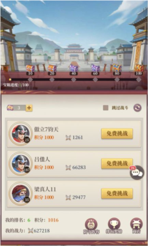 每次挑战可得一份随机奖励,如铜钱、武将经验、演武币、武灵丹等。