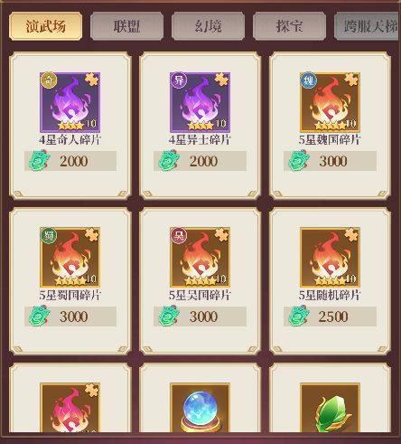 演武币可以前往商店兑换资源。如果只想开武将,前期建议买观星灵珠,开出5星的概率还是挺高的,比较划算。如果是想凑狗粮或指定武将,可定向购买武将碎片。