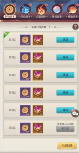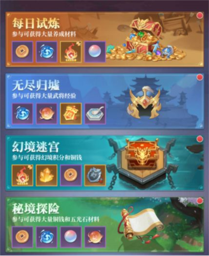 内含铜钱副本、经验副本、武将副本、神石副本和神通副本。