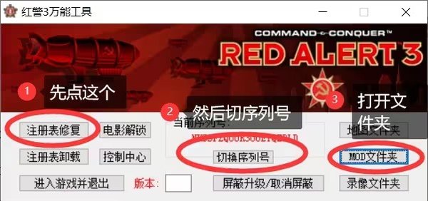 第一步:首先在游戏目录下打开ra3_tool.exe(即红警3万能工具),点一下注册表修复后,再切序列号,然后点MOD文件夹,打开Mods文件夹位置。