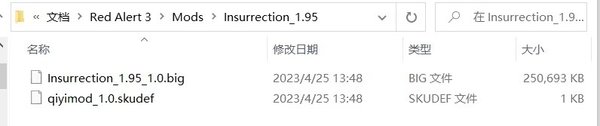注意解压时别文件夹嵌套文件夹了,路径应该是“C:Users你的用户名DocumentsRed Alert 3ModsInsurrection_1.95”,其中Insurrection_1.95文件夹下有Insurrection_1.95_1.0.big”和“qiyimod_1.0.skudef”两个文件