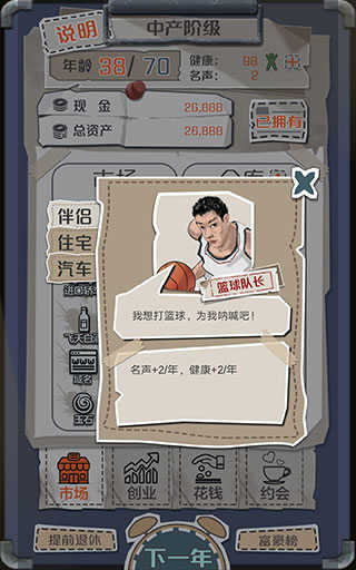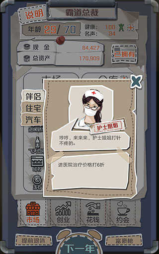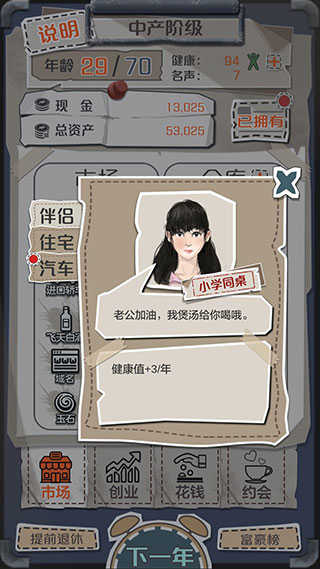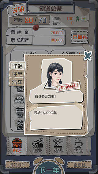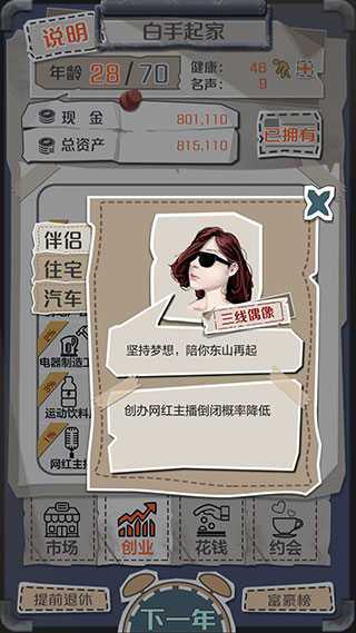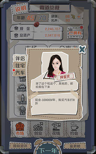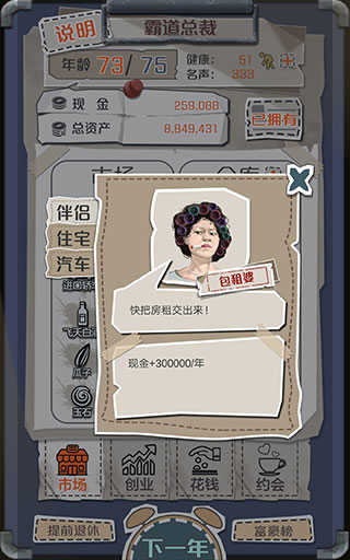 开局去约会约出大哥当伴侣,前期看行情低买高卖,出了低价就买进,高价或者平常价格卖掉就有得赚,手上钱到200多万的时候,去花钱-住宅界面里买个城郊公寓,然后跟大哥分手换包租婆当伴侣,接下来推荐按照大约1:2:1的比例屯比特币、汽车、域名这三样东西并逐渐扩仓库,爆高价就出手,低价或平价时再买进补仓,其他商品基本可以无视,同时多注意钱够不够买股票,只要够买药厂就直接买进,仓库成型之后,每年只要不停地把所有的钱都一直拿来买股票,退休资产破亿不难。