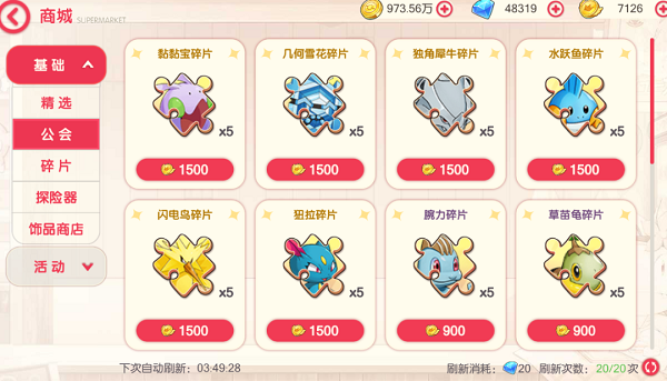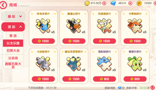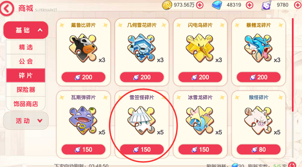 其他的材料,每周都要买一个紫色百变,主要是升级速度图鉴的精灵,上面有图自己对照下。这里的礼物跟彗星碎片也可以买,毕竟这个游戏的金币真的是太少了。