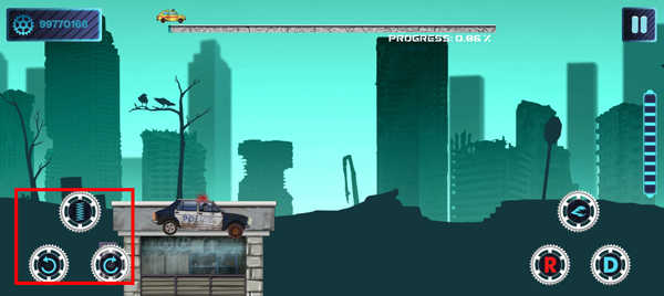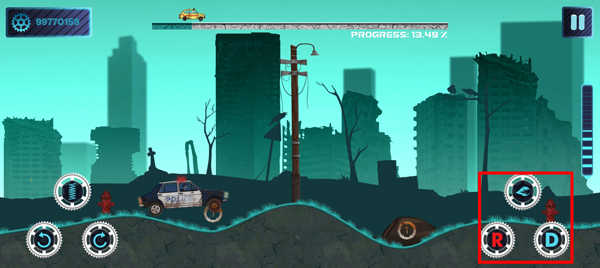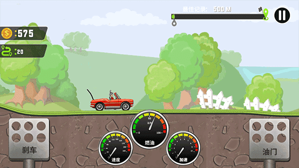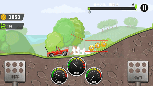 进入游戏后,使用屏幕上的按键操控车辆前进。左下角的按键分别用于车辆的跳跃、前轮抬起和后轮抬起,这些操作旨在帮助车辆保持平衡,避免翻车。