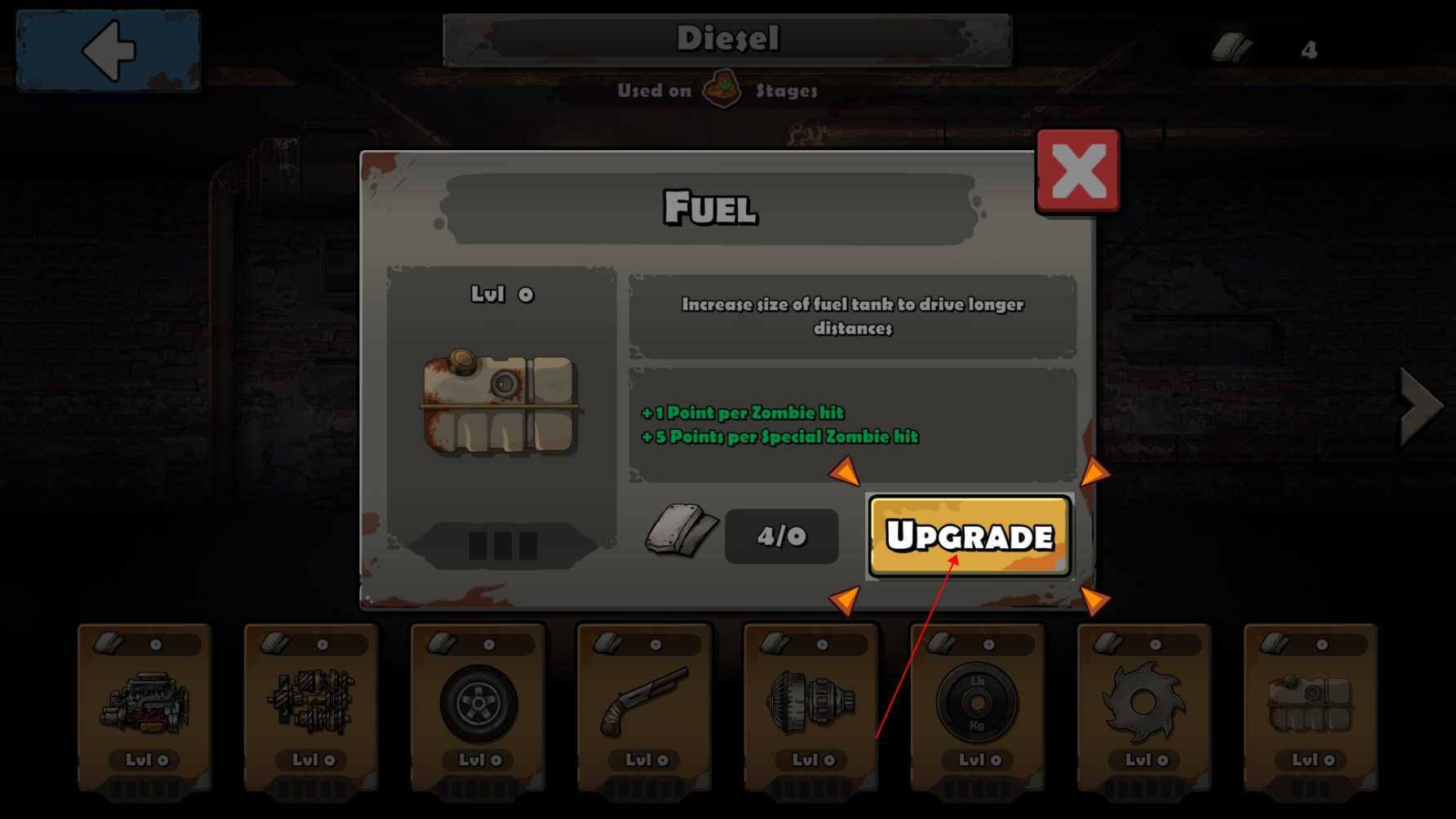多多升级。游戏中玩家们及时失败了也可以获得金币,金币可以让我们对汽车进行升级,如提高汽车的加速、防御能力等等,还可以在汽车上配置武器从而将僵尸们消灭在远处,而这些装备对于玩家们过关来说无疑是最重要的了。