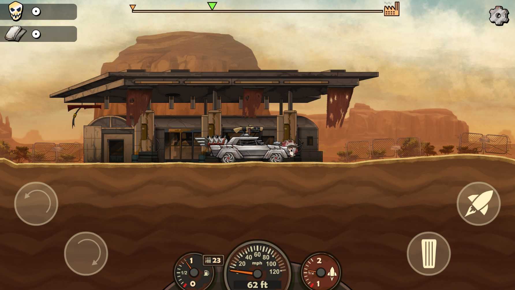 在战车行进的过程中,路上会充满了障碍物和僵尸,到后面的关卡会会出现大型的僵尸和更为坚硬的路障出现,这些都是为了阻止战车的前行,尽可能躲开或飞跃这些障碍物是到达更远距离的不二选择。在跑过几次后会对关卡的地形有一个熟悉,寻找一个合适使用推进器的路段是取得胜利的重要手段,这能够让你战车飞起来,小伙子,多攒点钱,让你的车飞起来吧。