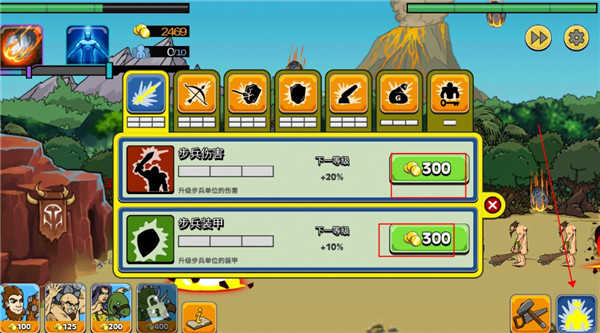 除此之外,点击右下角此处,还可以花费金币,升级士兵们的各项属性,以便能够更高的击溃敌方