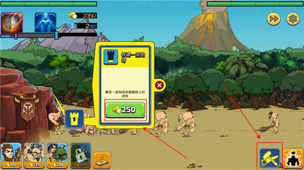 除了召唤士兵守卫基地外,我们还可以点击右下角的建造,为基地建造防御用的爬塔等防御设施