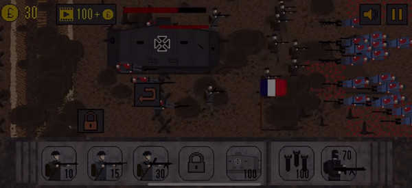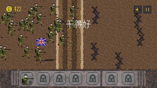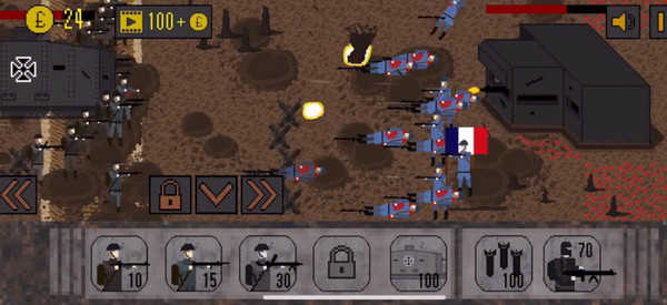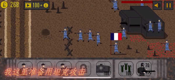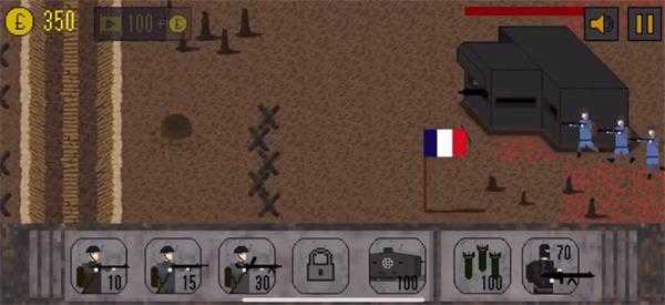 点击左下角购买士兵,士兵默认在战壕中,可点击命令进行攻击。但如果敌人的火力太猛,就不要让他们白白送死。然后逐步向敌国推进,在战斗过程中每消灭一个敌人都能获得积分并升级,从而成为更强大的部队。当然,敌人也会不断升级,使战斗变得越来越艰难。