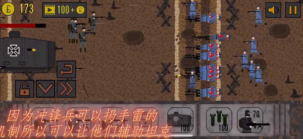随后开始游戏,你点击可以购买士兵,地下的数字表示需要的金币,后期还可以解锁坦克等,非常有趣;