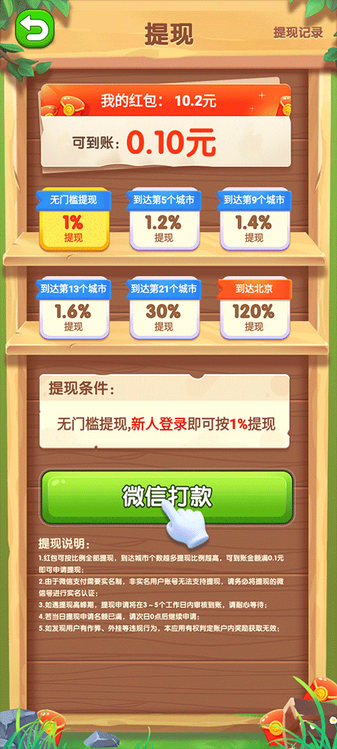 红包可按比例全部提现,到达城市个数越多提现比例越高,可到账金额满0.1元即可申请提现;