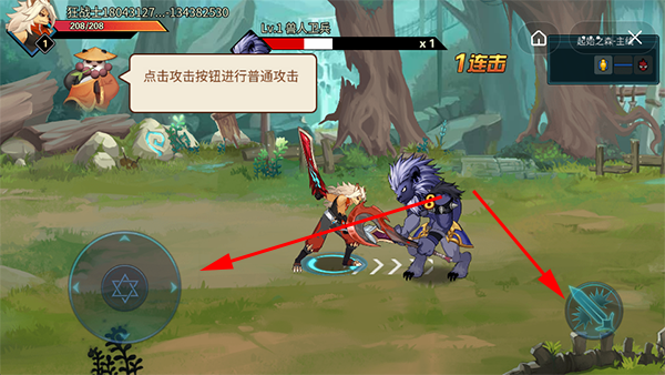 游戏内我们通过左侧移动角色,右侧点击攻击按钮进行普通攻击