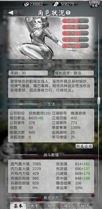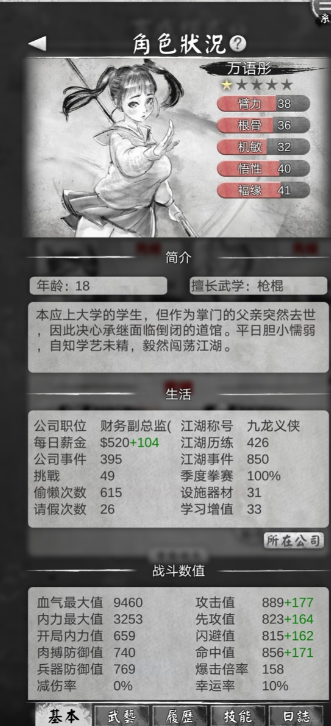 周末可以通过打架来提升心情和经验,并且锻炼角色。武功可以通过挑战不同的门派来获得。 到差不多第2年8,9月后,每月薪水到8000+时,就可以开始放松工作,开始专注于武功上。