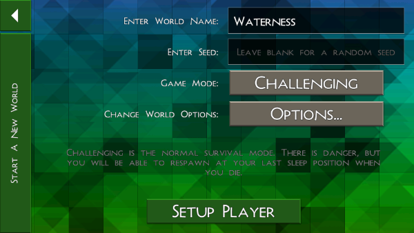 点击“new world”后,我们需要对创建世界,进行自定义的设置,设置完成后点击“setup player”