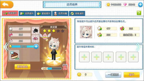 等级提升:可以通过经验书提升等级,也可以吃掉其他店员来升级(好残酷的喵星人世界)……可以选择材料手动添加,也可以让系统君一键添加。需要注意的是,只有珍贵度在R以下的路人店员,也就是N级店员,才会被一键添加,因此店长们不必担心自己喜欢的小哥哥会被吃掉。(什么?你说喜欢N级的?!emmm……)