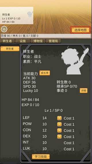 有了转生者,你可以在屏下左侧栏查看转生者的能力,接着就是把他分配到异世界去。点击屏上右下角的“选择地图”按钮,并且选择World1和Map1。