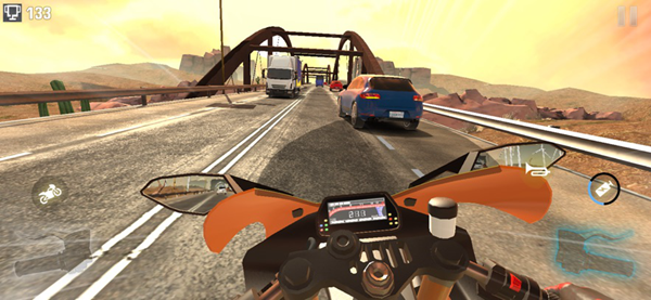 驾驶操作十分简单:摇动屏幕控制方向,注意躲避公路上的车辆;手动点击控制油门与刹车以及使用氮气加速;甚至还可以完成精彩的摩托抬头特技操作!