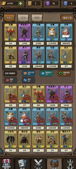 五虎上将:挑战无用(必须上阵五个),无尽可以叠伤害,后期伤害极高(关羽一紫一蓝输出主力)。