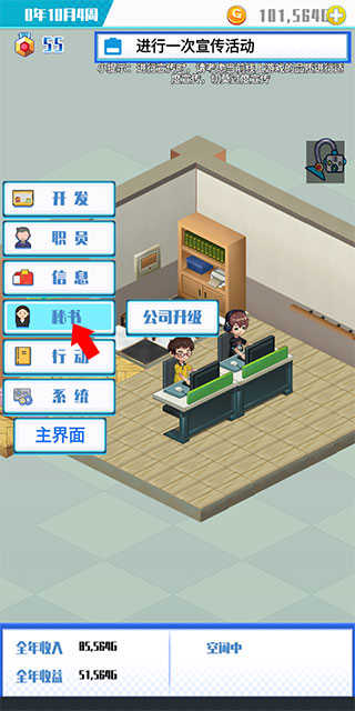 初始只拥有两个员工,如果想要招聘更多员工,需要点击秘书选项,然后点击公司升级,当满足条件之后就可以升级公司招聘更多员工了