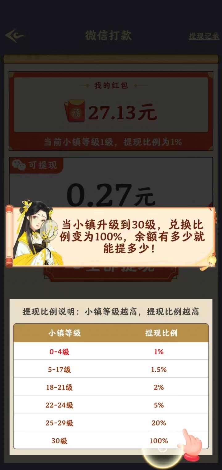 提现的时候需注意,如果当前小镇的等级为1级时,兑换比例为1%,即可以兑换0.27元;