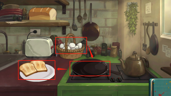 点击面包,将面包片拖至面包机,再将烤好的面包拖至盘子中