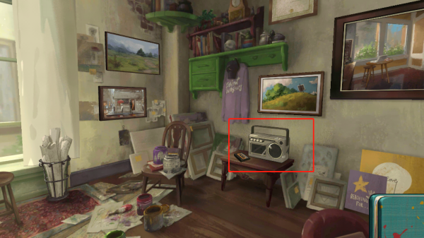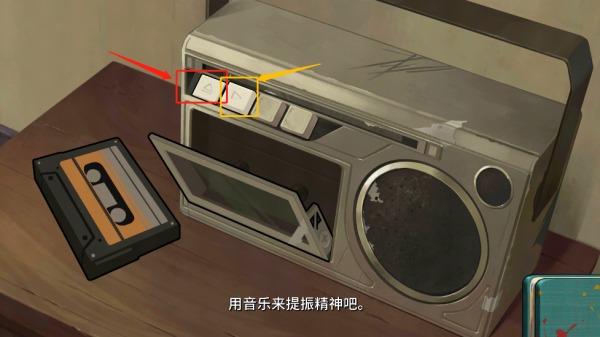 点击红框内按钮,打开收音机,将磁带放入,再点击黄框内按钮