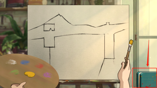20、点击获取的绿色颜料,再点击花架,用绿色部分将其填满,首先使用画笔沾取绿色颜料(点击调色板上的绿色即可)。