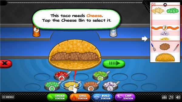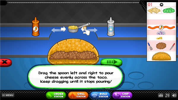 玩家只需左右滑动,即可撒上配菜,最后,所以配菜上完后,点击绿色方向键;