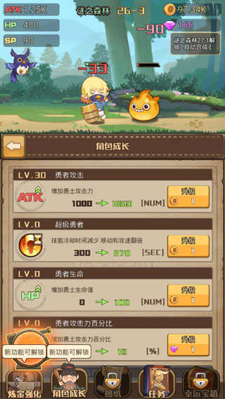 ②角色成长:顾名思义,利用货币直接提升角色属性,包含攻击、技能、生命等等,与炼金强化相似都需要达成一定的关卡才能解锁更多的选项。