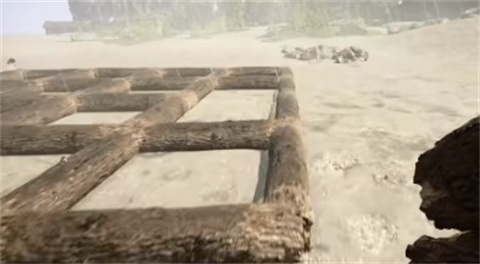 造好之后,玩家需要使用原木对着这个正方行的框,提示有白色虚线点击建造地板。